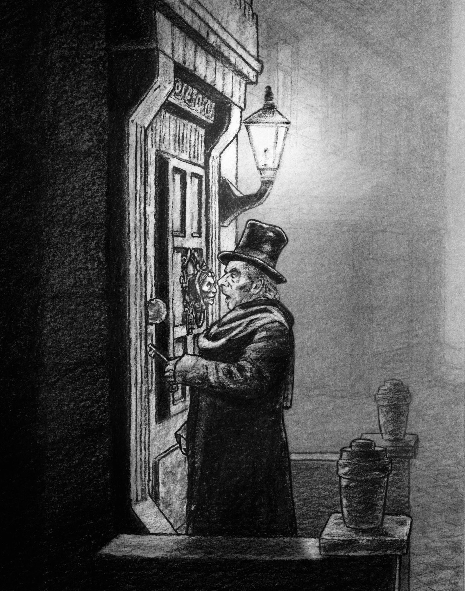 (...) Pues bien, que alguien me explique, si es capaz, cómo sucedió que Scrooge, tras introducir la llave en la cerradura de la puerta, viera en la aldaba, sin mediar transformación alguna, no una aldaba sino el rostro de Marley.