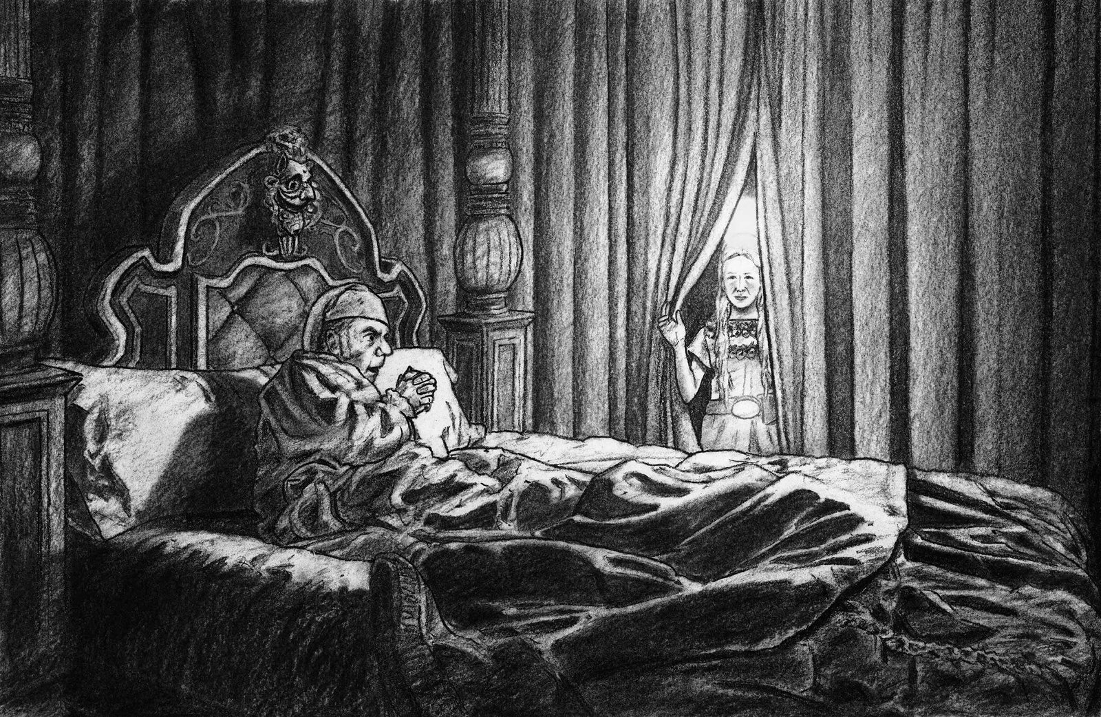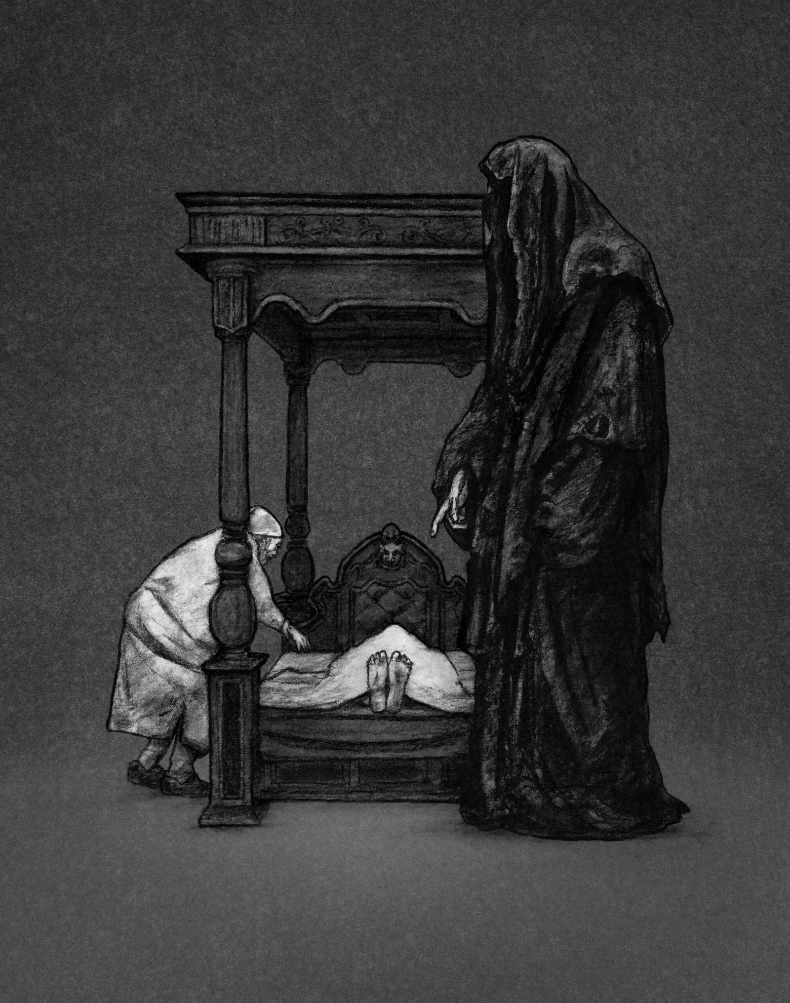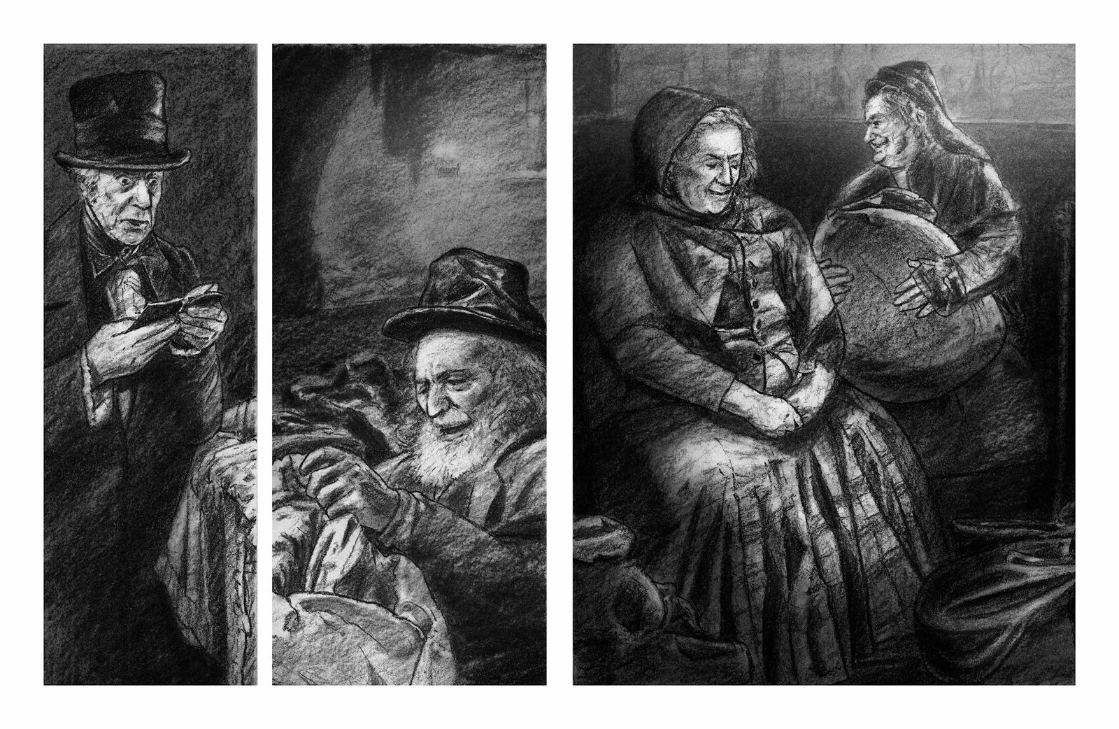 (...) Una pálida luz, que se elevaba en el aire exterior, caía directamente sobre la cama; y sobre ella, saqueada y despojada, sin vigilancia, sin lágrimas, sin cuidados, yacía el cuerpo de este hombre. Scrooge miró hacia el Fantasma. Su mano firme señalaba la cabeza.