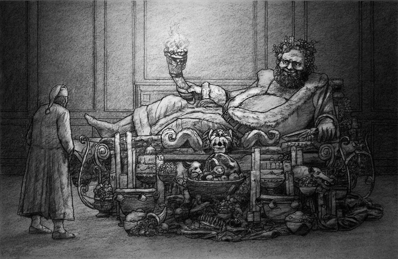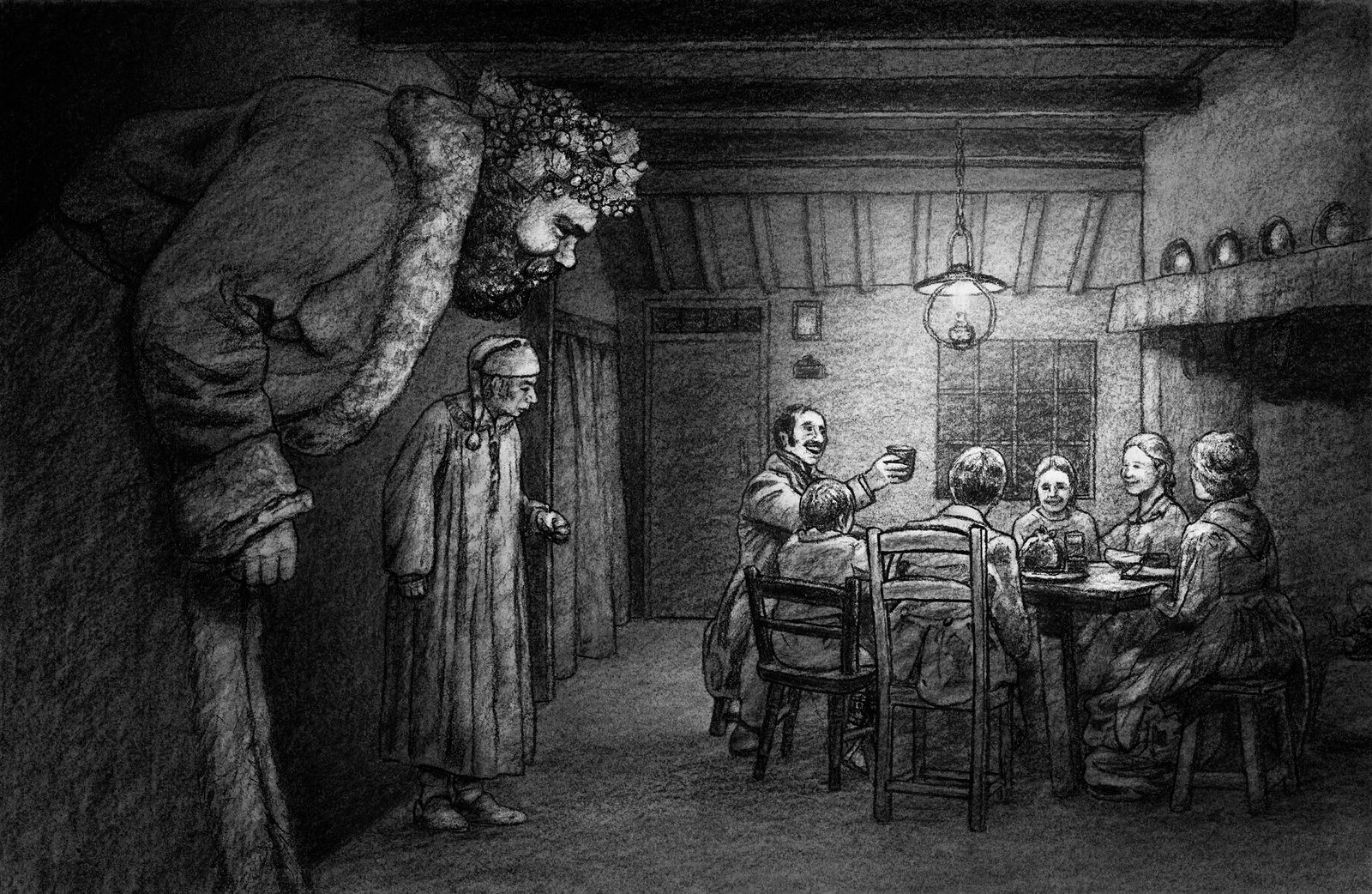 (...) Cómodamente sentado en aquel sofá se hallaba un alegre gigante al que daba gusto ver y que sostenía en alto una tea llameante, de forma no muy diferente al Cuerno de la Abundancia, para que vertiera su luz sobre Scrooge en cuanto este asomó y atisbó por la puerta. (...) —Soy el Fantasma de la Navidad del Presente —dijo el Espíritu—. ¡Mírame!