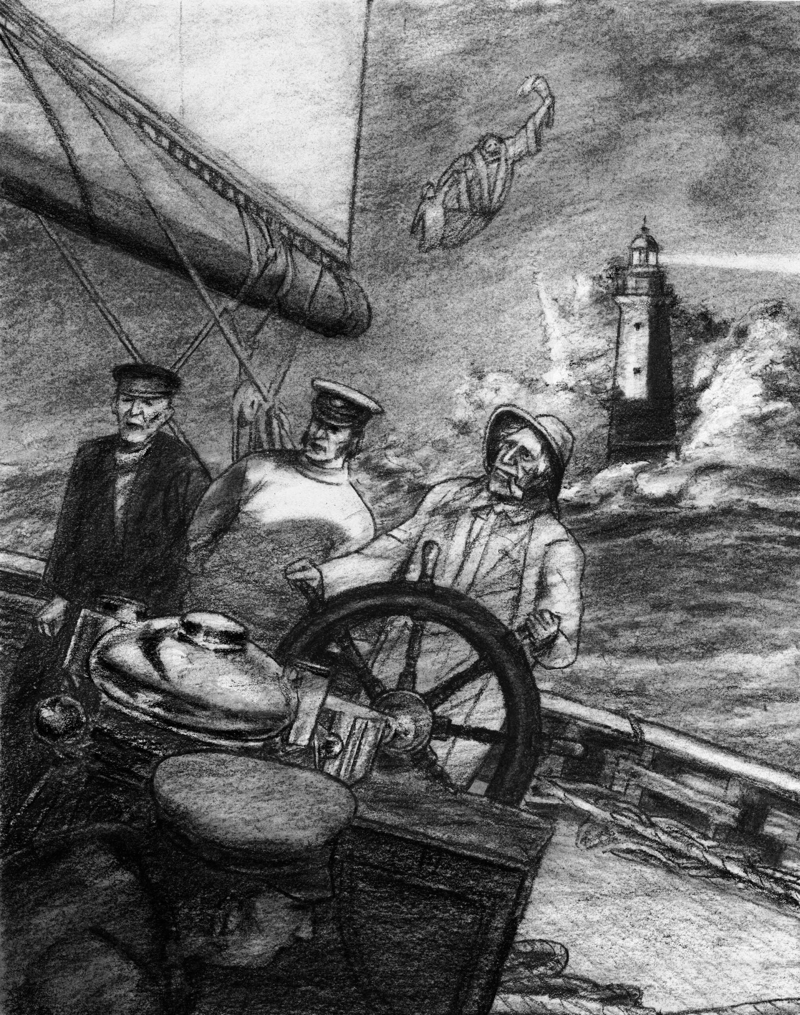 (...) (...) Construido sobre un sombrío arrecife de rocas sumergidas, a una legua más o menos de la costa, sobre el que las aguas se agitaban y rompían durante todo el año, se alzaba un solitario faro (...) De nuevo el fantasma se puso en marcha y sobrevoló aquel mar negro y convulso, hasta que, estando ya muy lejos de cualquier costa, según dijo a Scrooge, avistaron un barco.