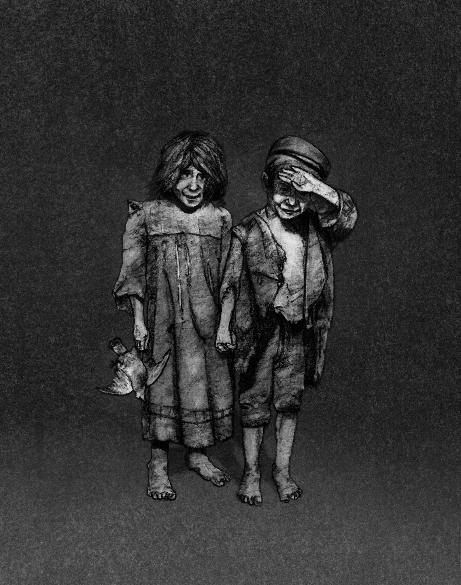 (...) «¡Oh, hombre! Mira aquí. Mira, mira, aquí abajo», exclamó el fantasma. (...) «¡Espíritu! ¿Son tuyos?», fue todo lo que Scrooge pudo decir. «Son del hombre», dijo el Fantasma, mirándolos desde arriba. (...) Este niño es la Ignorancia. Esta niña es la Necesidad. Cuídate de ambos...