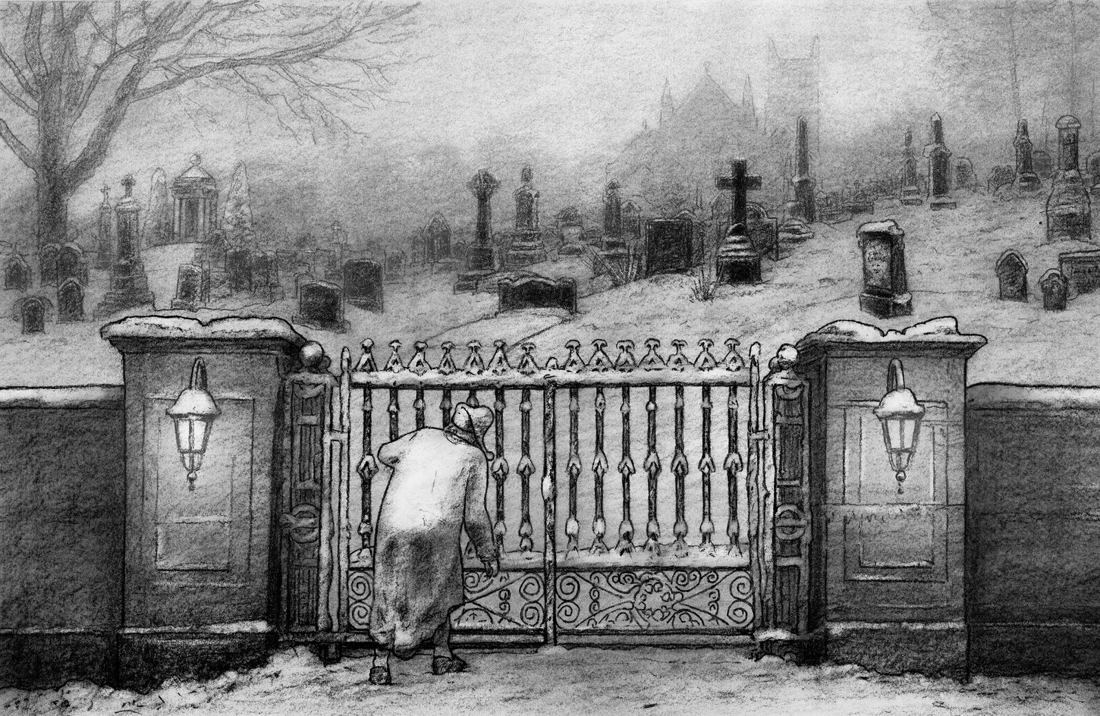 (...) Un cementerio. Aquí, pues, yacía bajo tierra el desgraciado hombre cuyo nombre ahora debía averiguar. (...) El Fantasma era exactamente igual que antes, pero temía haber visto un nuevo significado en su solemne figura.