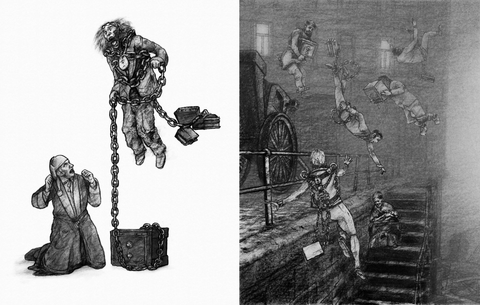 (...) El aire estaba repleto de fantasmas que vagaban de un lado al otro con agitada premura y sin dejar de gemir. (...) Había tenido una estrecha relación con un viejo fantasma que llevaba un chaleco blanco y una monstruosa caja de caudales de hierro atada a un tobillo y que lloraba compungido por resultarle imposible ayudar a una desdichada mujer y a un niño, a los que veía abajo...